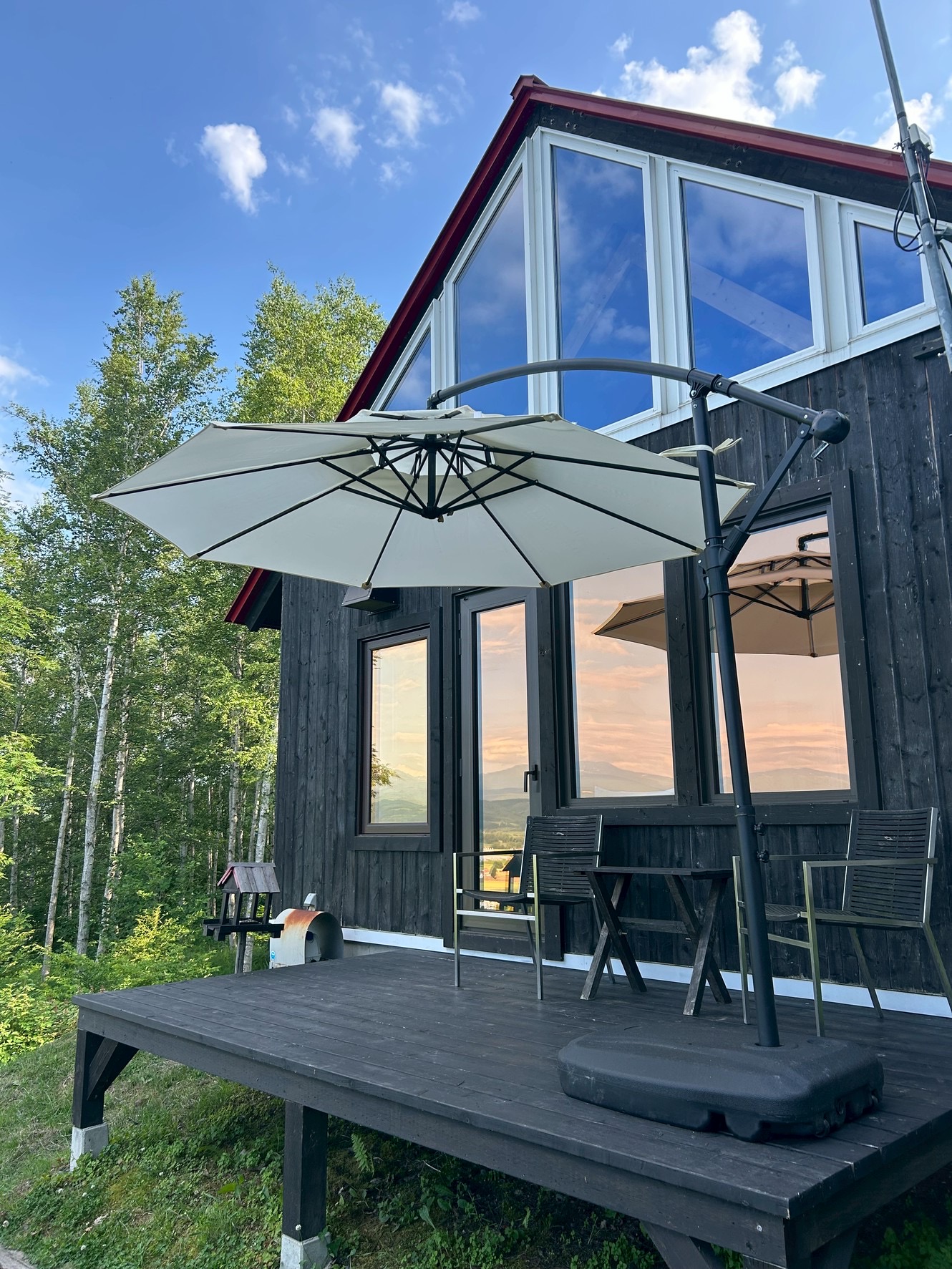 この夏は寝室側のウッドデッキにパラソルを設置しました。こちら側のイスに座って、朝日が昇るのを待ってください。コーヒーでも飲みながら。以前から屋根があるといいなあと思っていたのですが、せっかく三角の窓から青空が見えるのに邪魔するのは良くないよねと、躊躇していました。パーゴラを増設するのもイメージが違う、クルクル巻いて仕舞うアーケードのようなものも違うとズルズル先延ばしにしていました。が、この度折りたためるパラソルを設置してみたら良い感じ。白いパラソルは青い空に似合いました。